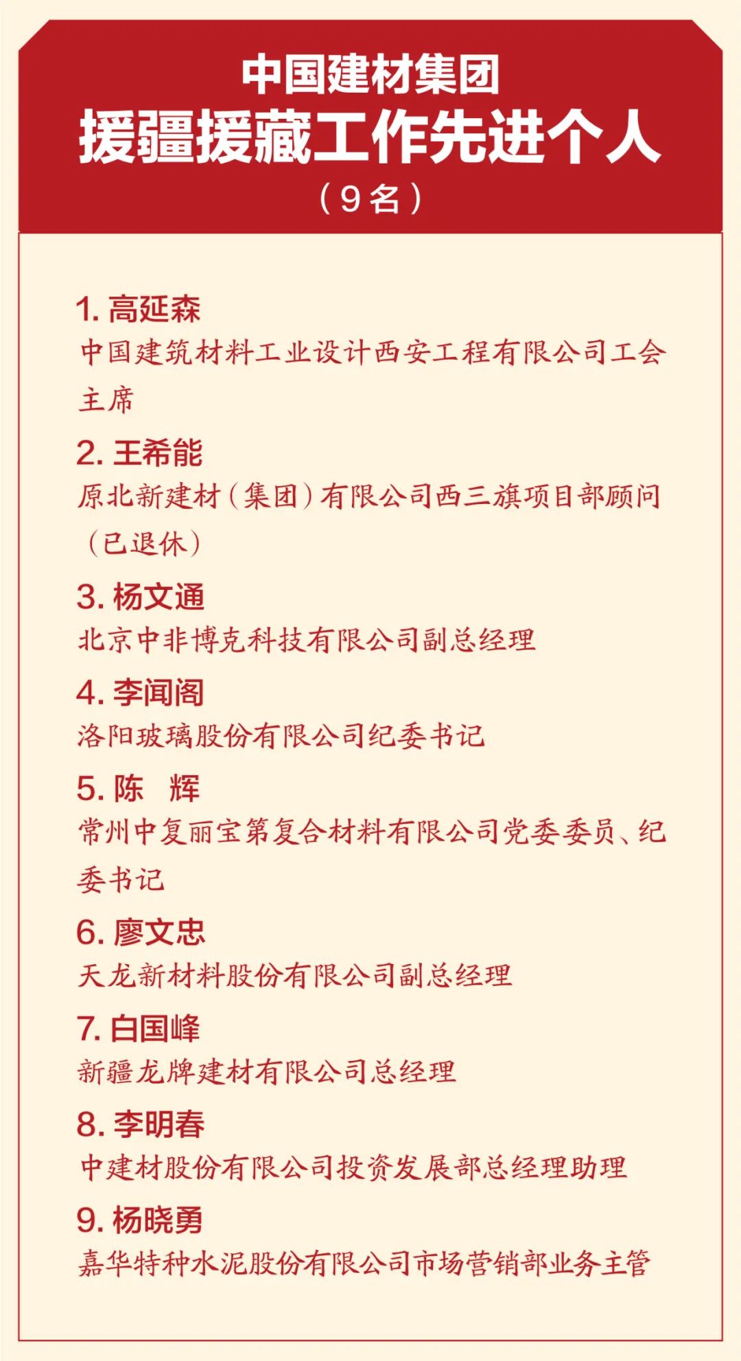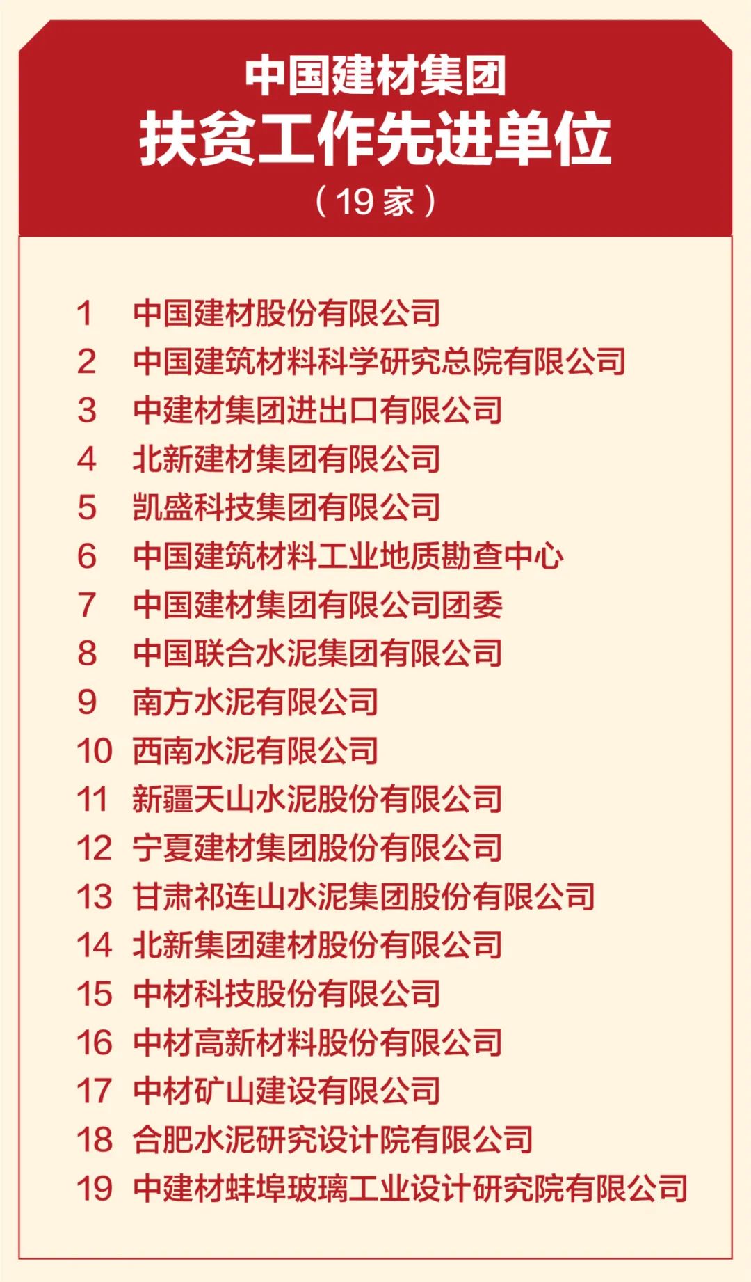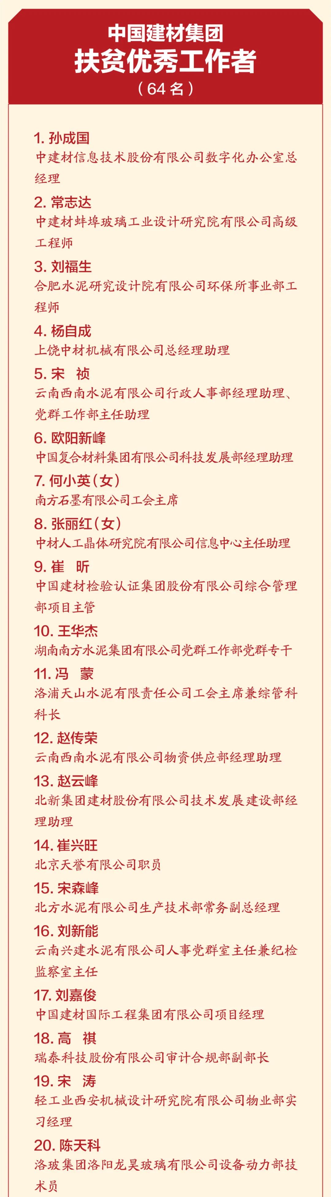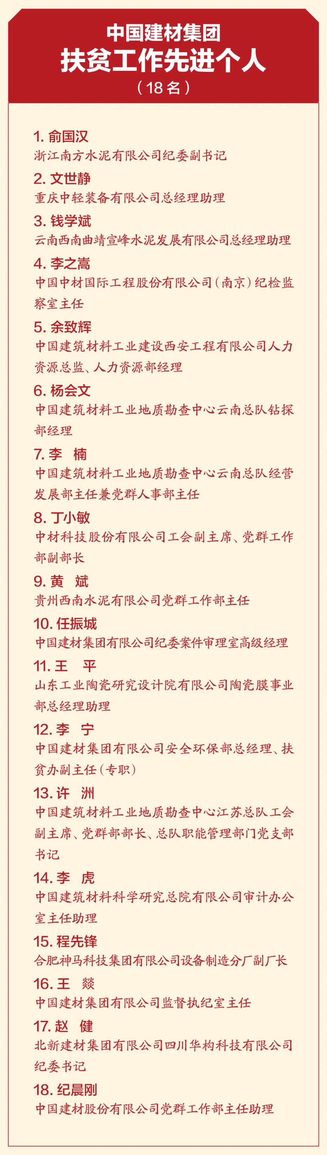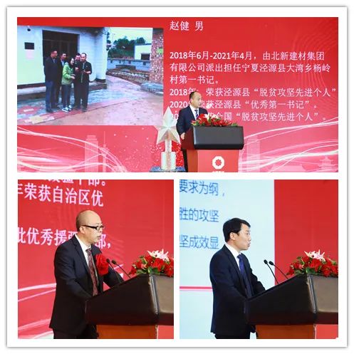 4月19日,中國建材集團扶貧工作暨援疆援藏工作表彰大會在京召開,會議深入學(xué)習(xí)貫徹習(xí)近平總書記重要講話精神,特別是習(xí)近平總書記關(guān)于扶貧工作的系列重要論述,全面總結(jié)集團扶貧工作及援疆援藏工作任務(wù)完成情況,表彰集團在扶貧工作和援疆援藏工作中涌現(xiàn)出來的先進個人和集體,并就接續(xù)鄉(xiāng)村振興做好下一階段工作做出安排部署。 中國建材集團扶貧工作紀(jì)實片 國資委科技創(chuàng)新和社會責(zé)任局副局長張曉紅出席會議并致辭,國家鄉(xiāng)村振興局社會扶貧司定點扶貧處處長周曉云,中國志愿服務(wù)基金會副理事長兼秘書長姚桂清出席會議。集團黨委書記、董事長周育先發(fā)表重要講話,集團黨委副書記、董事、總經(jīng)理曹江林宣讀表彰決定。集團黨委常委、副董事長李新華,黨委副書記孫力實,黨委常委、總會計師詹艷景,黨委常委、紀(jì)委書記楊杰,黨委常委、副總經(jīng)理王于猛、魏如山出席會議。 國資委科技創(chuàng)新和社會責(zé)任局副局長張曉紅 張曉紅在致辭中對中國建材隆重召開扶貧工作暨援疆援藏工作表彰大會表示祝賀!對中國建材在脫貧攻堅、援疆援藏工作中取得的成績表示肯定!她指出:中國建材舉全集團之力,盡銳出戰(zhàn),傾心幫扶,在扶貧工作和援疆援藏工作中體現(xiàn)出了“政治站位高、幫扶措施實、干部作風(fēng)硬、脫貧成效好”四個鮮明特點。希望中國建材繼續(xù)做好鞏固拓展脫貧攻堅成果同鄉(xiāng)村振興有效銜接,充分發(fā)揮中國建材的綜合優(yōu)勢,在落實鄉(xiāng)村振興戰(zhàn)略、助力農(nóng)村高質(zhì)量發(fā)展中作出新貢獻,取得新成績。 中國建材集團黨委書記、董事長周育先 周育先在講話中重申了扶貧工作與援疆援藏工作的重要意義。打贏脫貧攻堅戰(zhàn),是全面建成小康社會最艱巨的任務(wù),是以習(xí)近平同志為核心的黨中央向國內(nèi)外做出的莊嚴(yán)承諾。援疆援藏工作是貫徹新時代黨的治疆治藏方略的工作要求。中國建材始終堅持聽黨話、跟黨走,不忘初心、牢記使命、勇?lián)?zé)任,堅決貫徹落實黨中央、國務(wù)院和上級有關(guān)單位關(guān)于脫貧攻堅、援疆援藏工作的各項部署要求。 周育先在講話中從四個方面回顧了中國建材的扶貧工作和援疆援藏工作。一是堅持黨的領(lǐng)導(dǎo),提高政治站位,強化組織保證。二是突出精準(zhǔn)施策,注重因地制宜,提高脫貧實效。三是創(chuàng)新幫扶模式,善用平臺資源,凝聚各方力量。四是嚴(yán)格干部選派,加強作風(fēng)建設(shè),踐行初心使命。他指出:中國建材能取得這樣的成績,根本在于黨的堅強領(lǐng)導(dǎo)、在于全方位精準(zhǔn)施策、在于發(fā)揮好自身優(yōu)勢、在于凝聚起各方力量。在投身脫貧攻堅過程中:我們堅決落實以習(xí)近平同志為核心的黨中央決策部署,深入學(xué)習(xí)貫徹習(xí)近平新時代中國特色社會主義思想特別是習(xí)近平總書記關(guān)于扶貧工作的系列重要論述;我們認真落實以人民為中心的發(fā)展思想,堅決把精準(zhǔn)扶貧方略落到實處,真扶貧、扶真貧;我們統(tǒng)籌推進企業(yè)發(fā)展與幫扶工作,精準(zhǔn)實施六大幫扶措施;我們充分調(diào)動干部員工積極性和主動性,舉全集團之力,盡銳出戰(zhàn);我們與幫扶地區(qū)干部群眾同想同干,共謀發(fā)展。在扶貧工作和援疆援藏工作這場大戰(zhàn)大考中戰(zhàn)出了精氣神、考出了好成績。 脫貧摘帽不是終點,而是新生活、新奮斗的起點。2021年是十四五的開局之年,是全面實施鄉(xiāng)村振興戰(zhàn)略的起步階段。周育先要求:要以落實中央各項決策部署為根本,落實中央關(guān)于鄉(xiāng)村振興、援疆援藏的工作要求;落實集團幫扶政策,圍繞六大幫扶措施進行統(tǒng)籌安排;關(guān)心關(guān)愛幫扶干部,支持他們的工作,使幫扶干部心無旁騖的投入鄉(xiāng)村振興工作。要以黨史學(xué)習(xí)教育為契機,學(xué)史明理、學(xué)史增信、學(xué)史崇德、學(xué)史力行,不忘共產(chǎn)黨人的初心使命,大力弘揚脫貧攻堅精神,團結(jié)一心,英勇奮斗,與定點幫扶地區(qū)一起做好鞏固拓展脫貧攻堅成果與鄉(xiāng)村振興有效銜接工作,乘勢而上,再接再厲,接續(xù)奮斗,以優(yōu)異成績獻禮建黨百年! 中國建材集團黨委副書記、董事、總經(jīng)理曹江林 曹江林宣讀表彰決定,黨的十八大以來,集團積極響應(yīng)習(xí)近平總書記號召,認真貫徹落實黨中央、國務(wù)院和上級有關(guān)單位關(guān)于脫貧攻堅決策部署,集全集團之力,盡銳出戰(zhàn)、合力攻堅。2020年我國脫貧攻堅戰(zhàn)取得了全面勝利,區(qū)域性整體貧困得到解決,完成了消除絕對貧困的艱巨任務(wù)。集團定點幫扶的五個縣區(qū)已脫貧出列,援疆援藏工作也取得了階段性成果。為表彰在脫貧攻堅及援疆援藏工作中涌現(xiàn)出的先進個人和先進集體,充分展現(xiàn)脫貧攻堅成效成果,經(jīng)集團黨委研究決定:授予中國建材股份有限公司等19家成員企業(yè)“扶貧工作先進單位”稱號,授予俞國漢等18名同志“扶貧工作先進個人”稱號,授予高延森等9名同志“援疆援藏工作先進個人”稱號,授予孫成國等64名同志“扶貧優(yōu)秀工作者”稱號。 永善縣委書記戈昌武 石臺縣委書記李軍 永善縣委