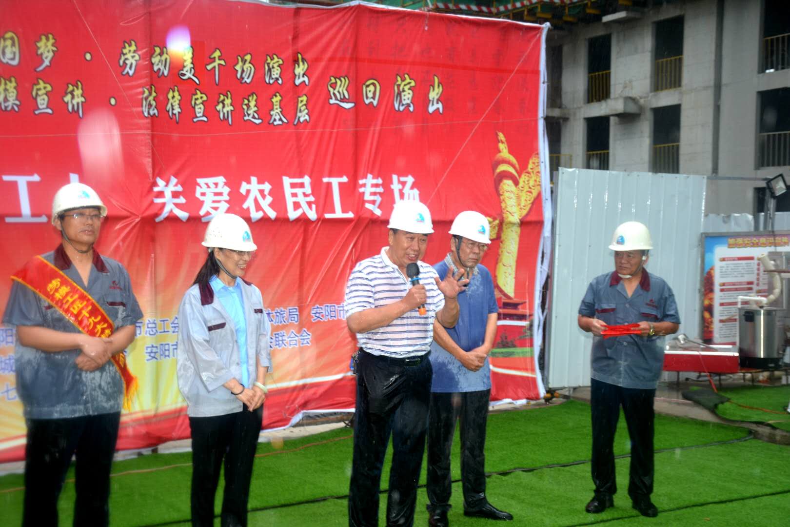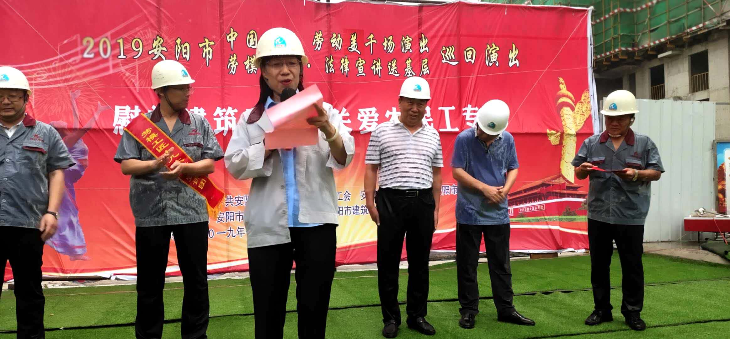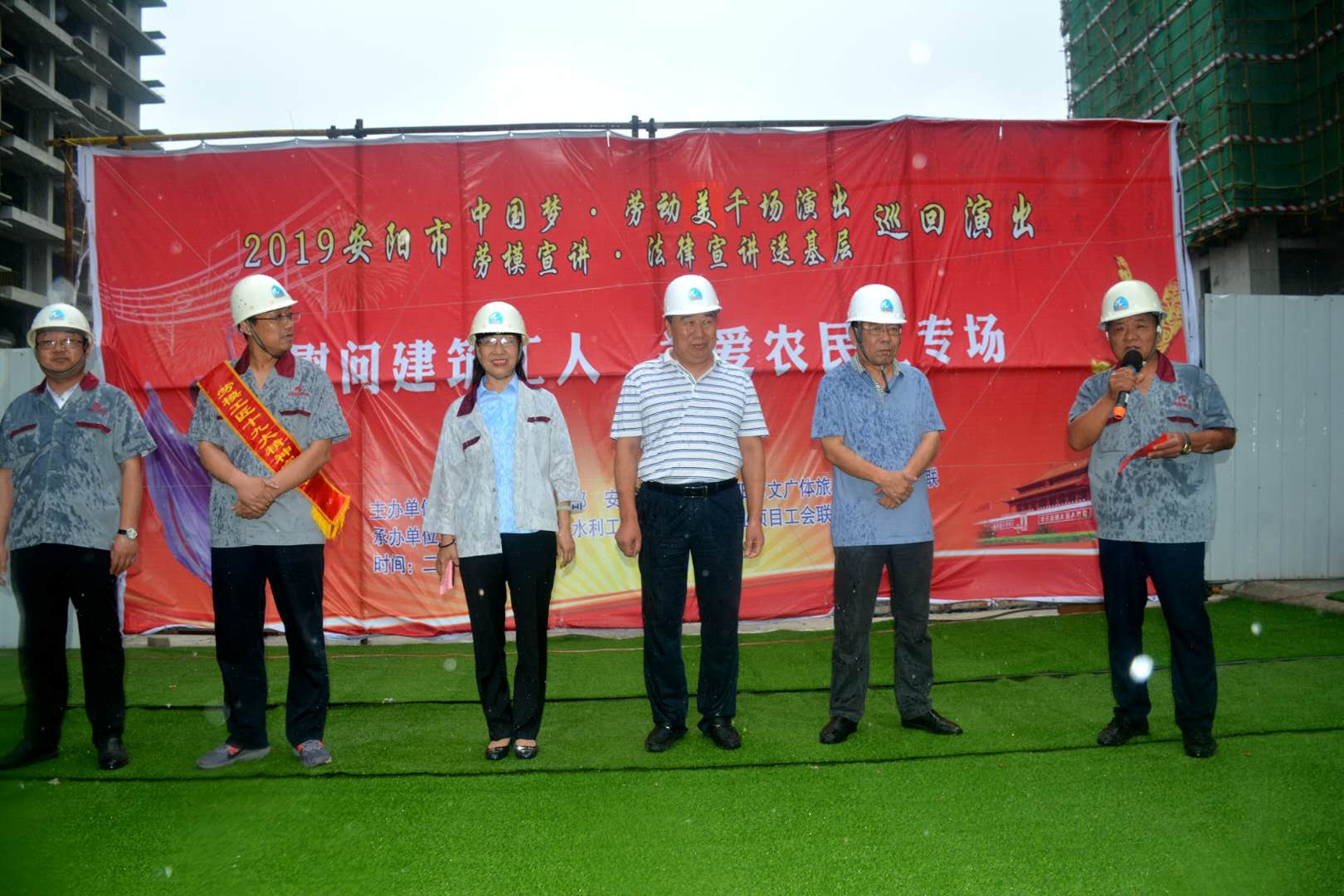7月9日下午,2019年安陽(yáng)市中國(guó)夢(mèng)·勞動(dòng)美千場(chǎng)演出暨勞模宣講·法律宣講送基層巡回演出“慰問(wèn)建筑工人,關(guān)愛(ài)農(nóng)民工專場(chǎng)”活動(dòng)在河南鴻宸建設(shè)有限公司御水園項(xiàng)目如期舉行,此次活動(dòng)由市宣傳部、市總工會(huì)、市文廣體局和市文聯(lián)主辦,市城建交通水利工會(huì)和市建筑業(yè)項(xiàng)目工會(huì)聯(lián)合會(huì)承辦,市建筑業(yè)工會(huì)主席宋志剛、市城建交通水利工會(huì)馬松林常委等一行領(lǐng)導(dǎo)蒞臨活動(dòng)現(xiàn)場(chǎng),河南鴻宸建設(shè)有限公司副總經(jīng)理宋國(guó)良、工會(huì)主席李萬(wàn)英、市勞模劉用林、總工費(fèi)萬(wàn)寶及相關(guān)部室負(fù)責(zé)人員參加了活動(dòng)。